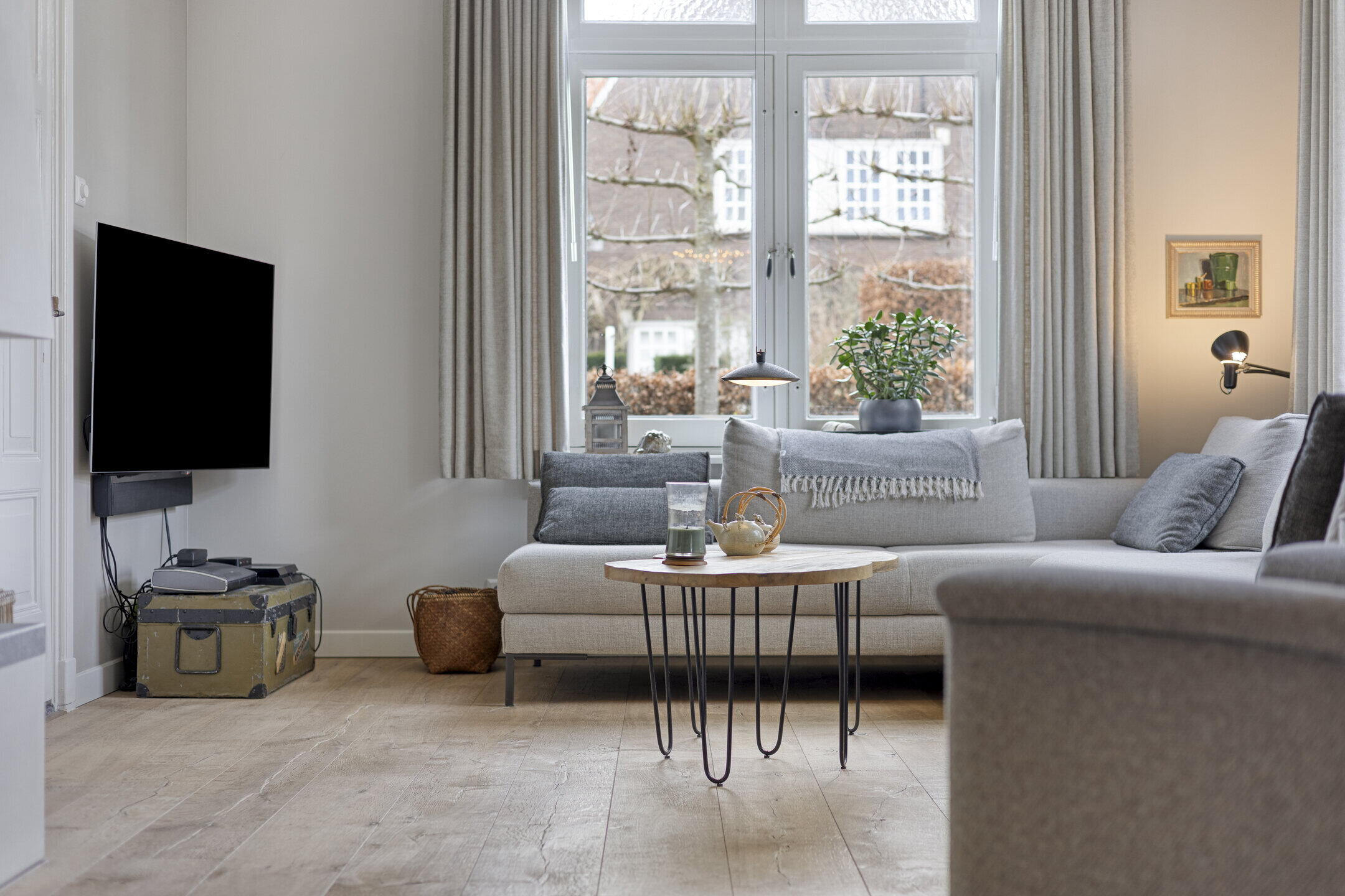 De woonkamer is een lichte en comfortabele ruimte met grote ramen aan zowel de voor- als de zijgevel. Deze ramen zijn voorzien van houten luiken die zowel functioneel als sfeervol zijn en nog in uitstekende staat verkeren. In de woonkamer vormt de gashaard een warm middelpunt.