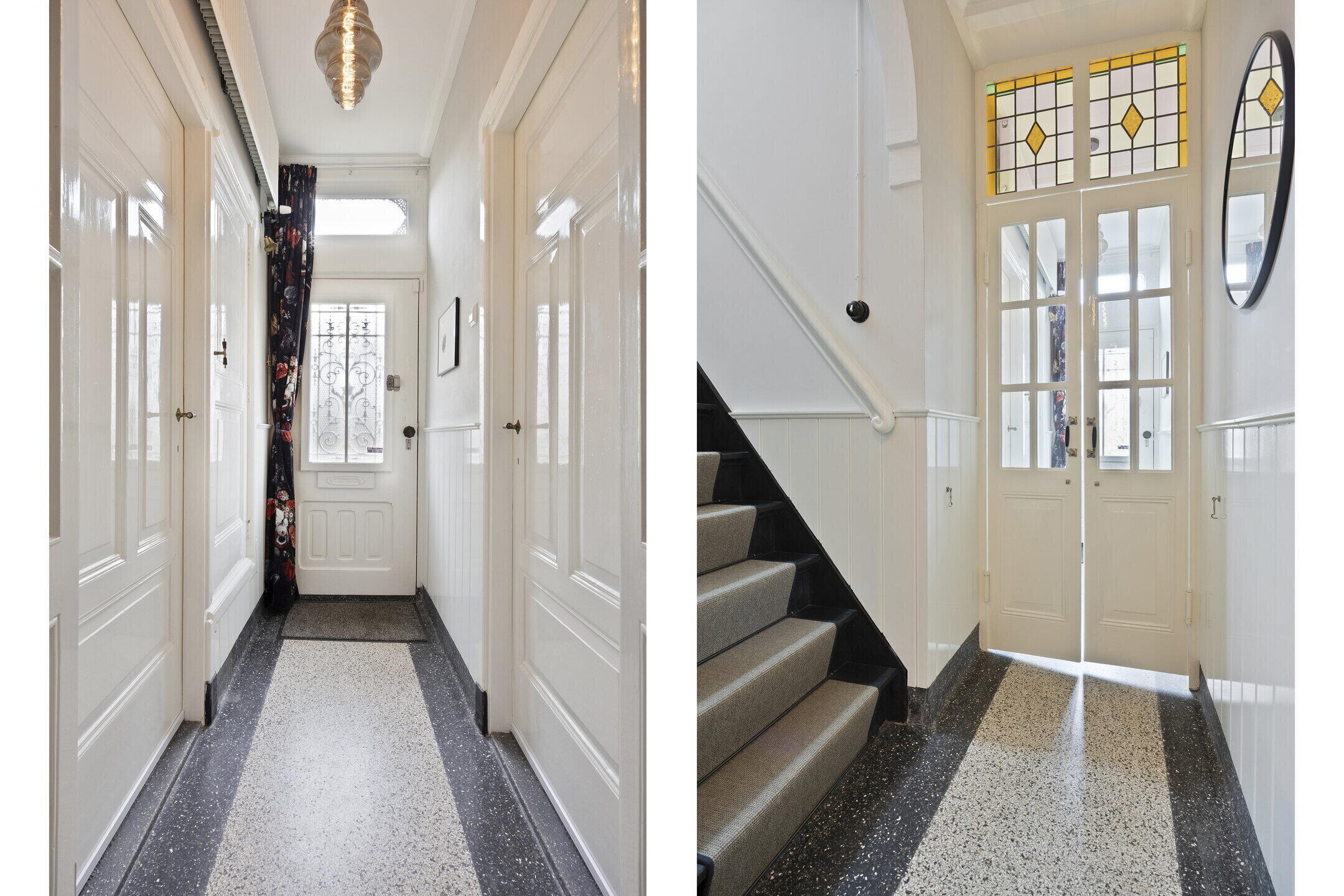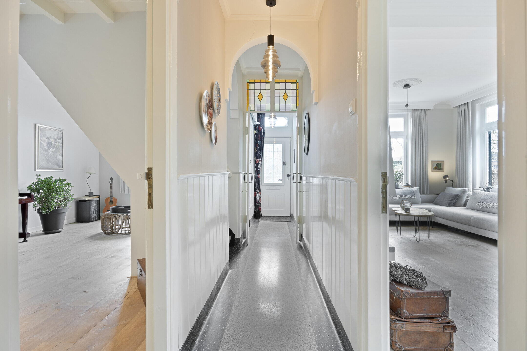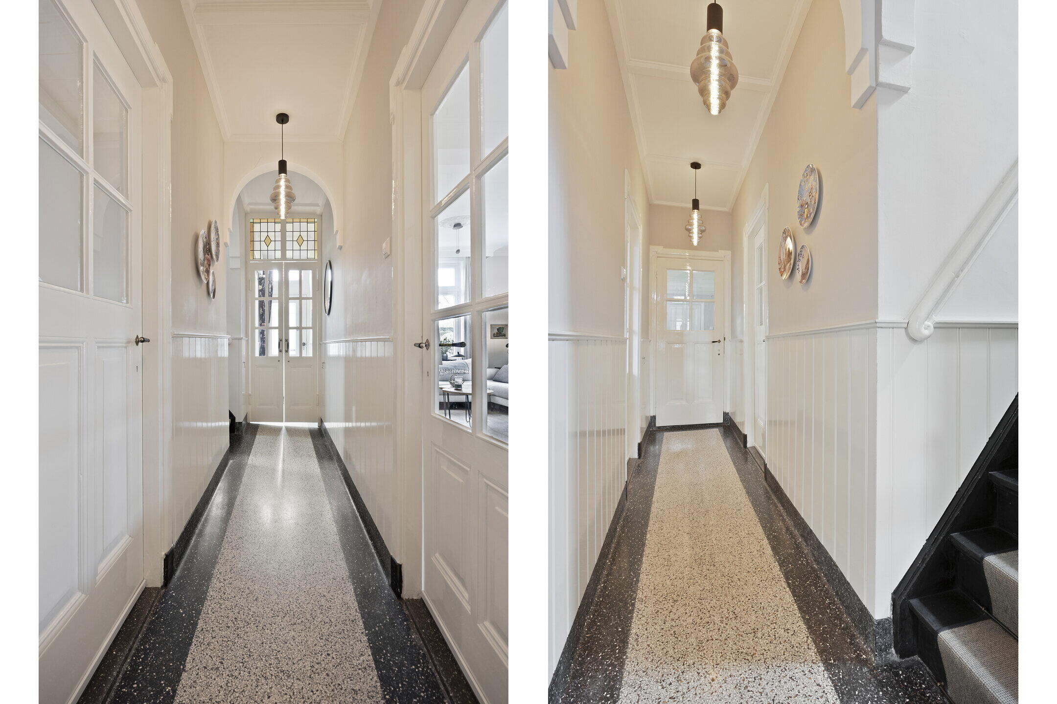 Via de entree komt u in de sfeervolle hal met de karakteristieke granieten terrazzovloer en authentieke details die direct de sfeer van deze jaren ’30 woning benadrukken. Vanuit de hal zijn de verschillende leefruimtes bereikbaar.