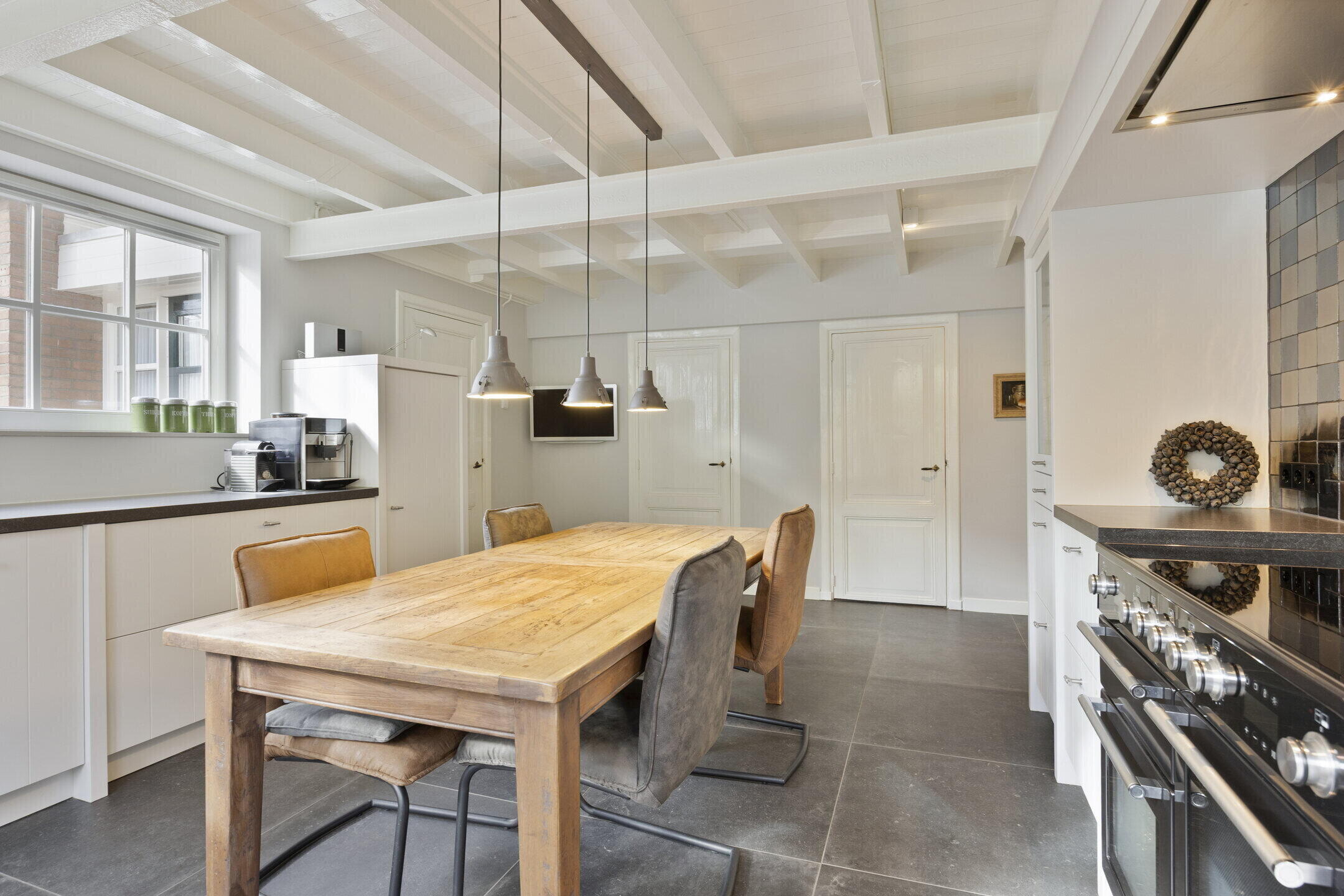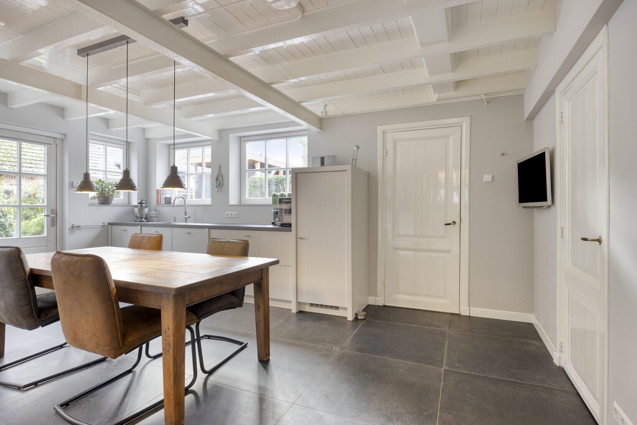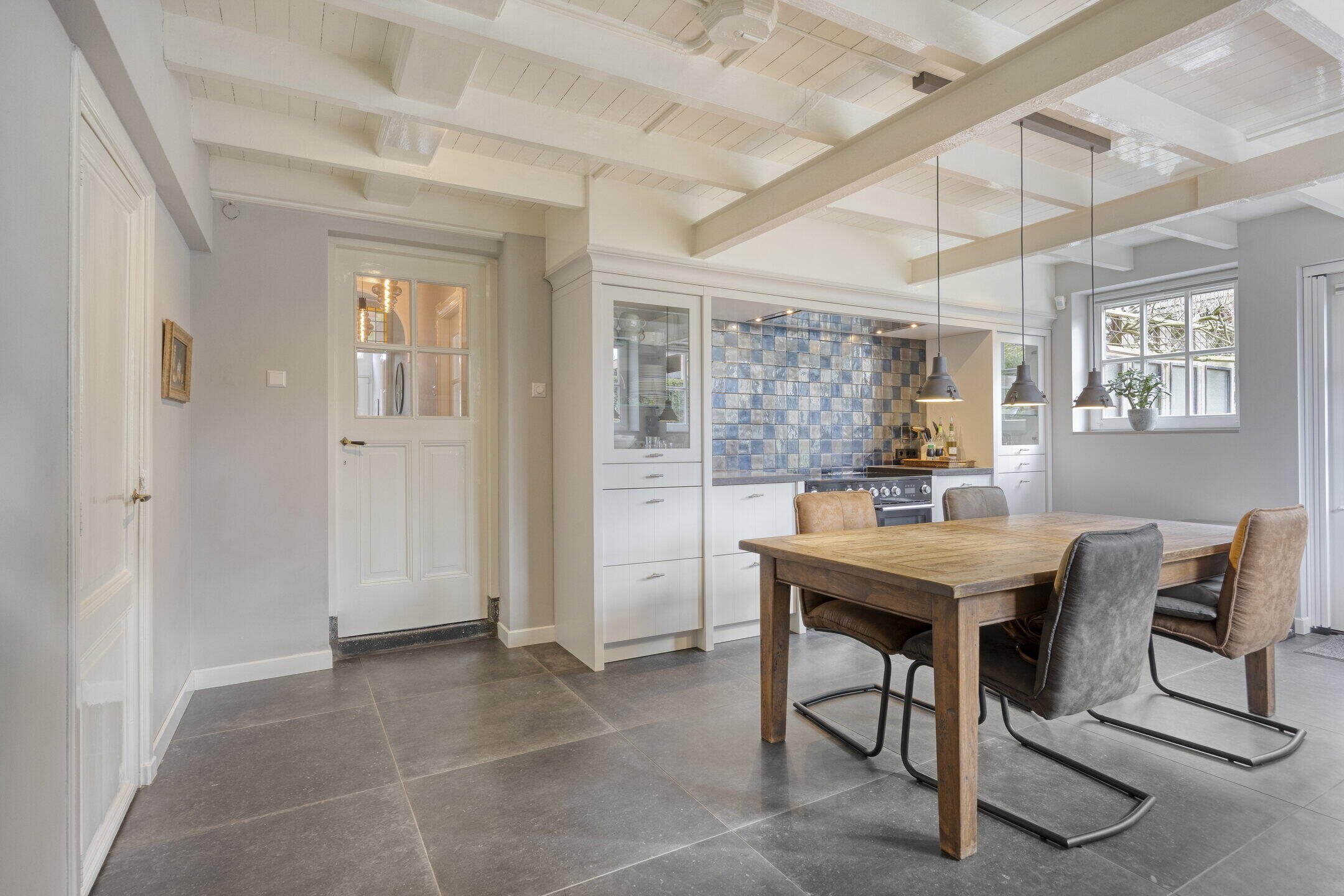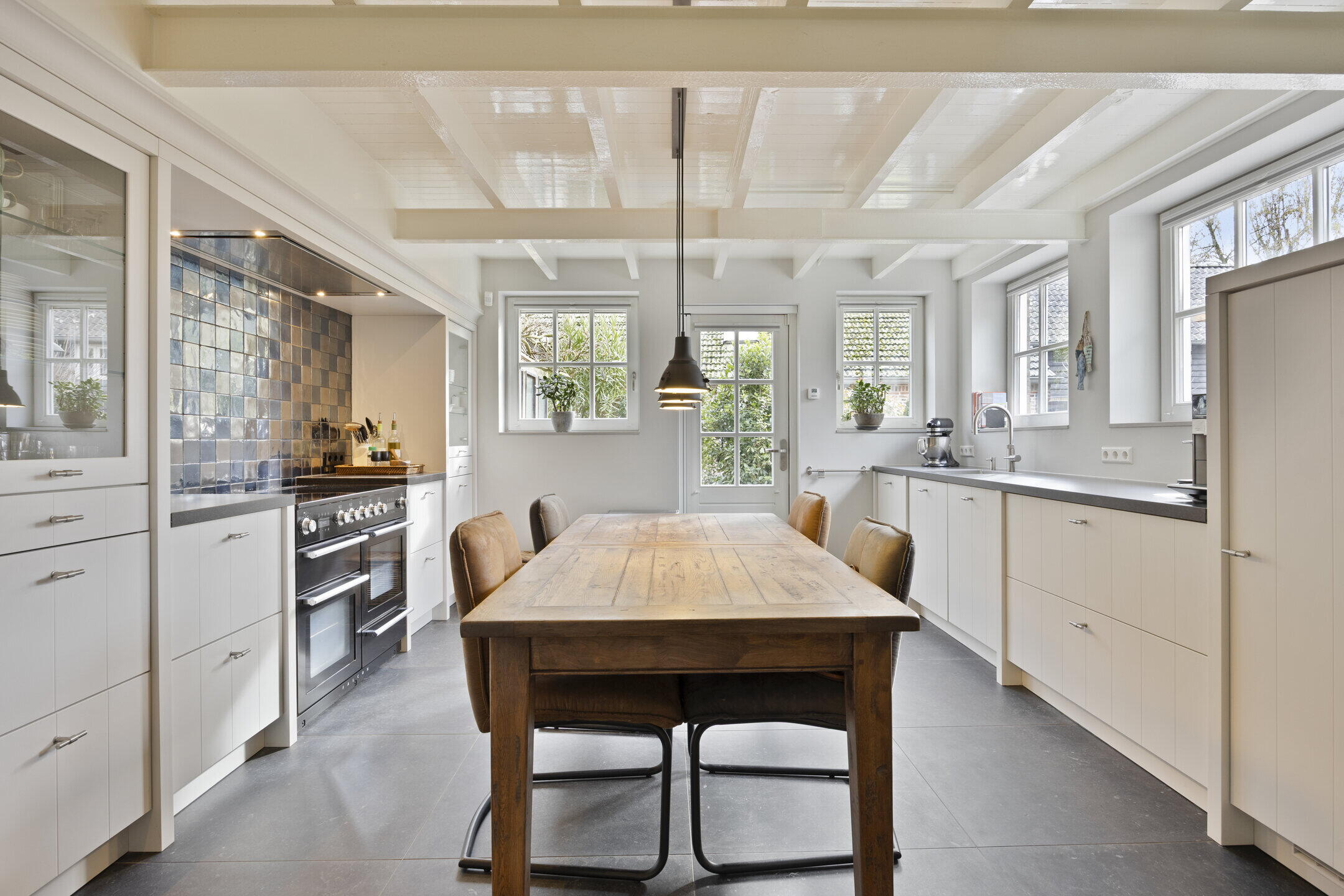 De keuken staat in directe verbinding met de tuin en de garage en vormt daarmee een praktisch middelpunt van het huis.
