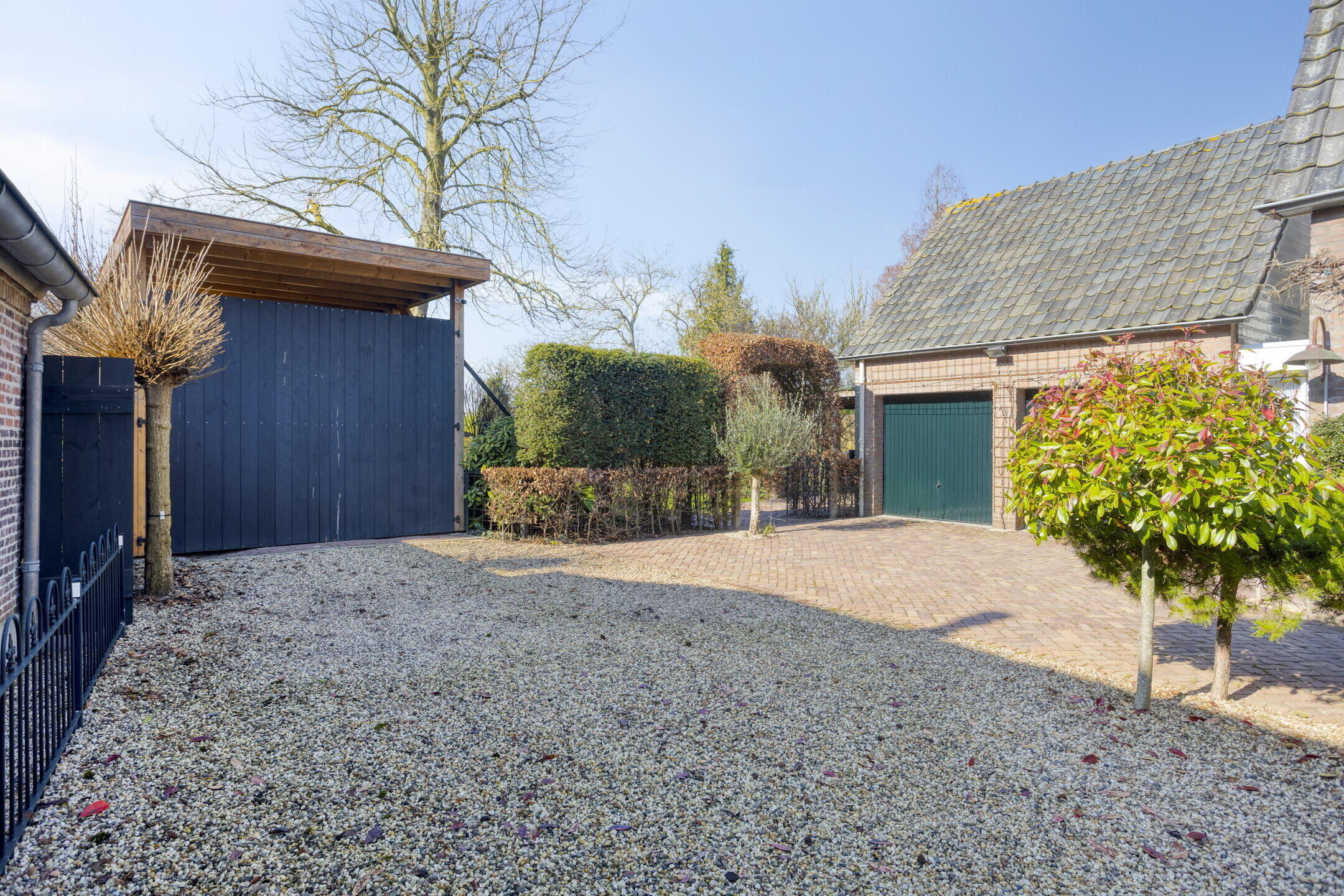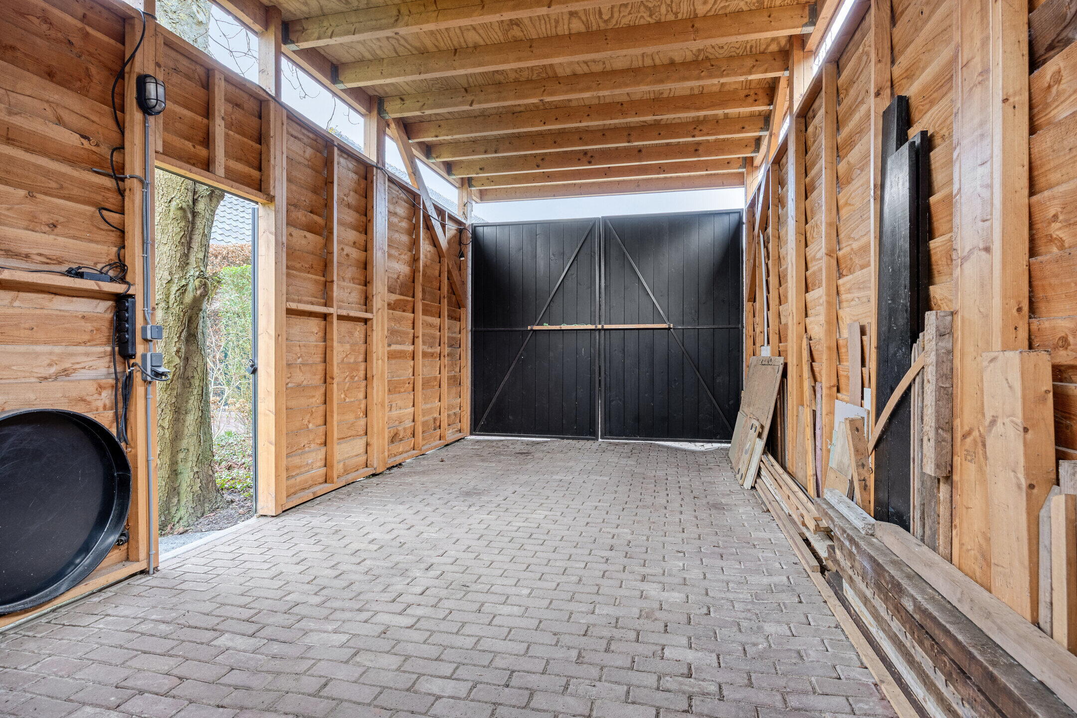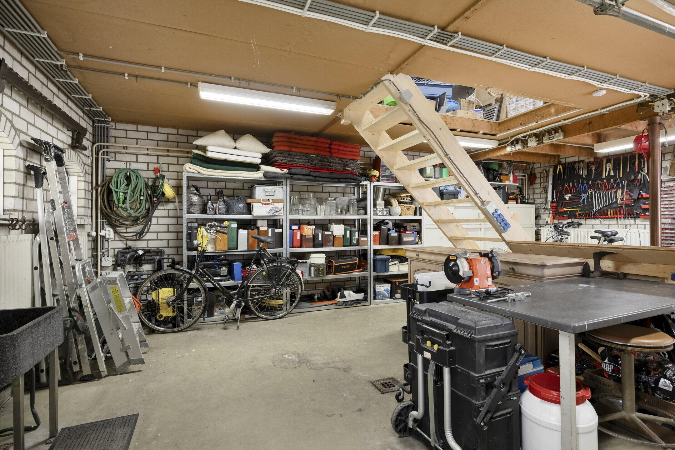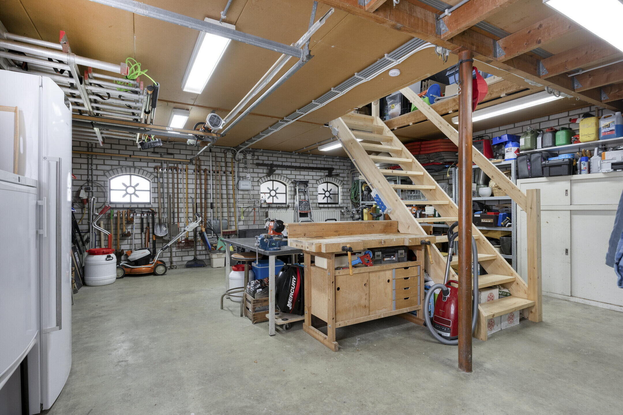 Aan de achterzijde van de woning bevindt zich een zeer ruime dubbele garage die ook vanuit de keuken bereikbaar is. Ook hier zijn in 2020 warm- en koudwateraansluitingen en een afvoer aangelegd. De garage beschikt over een vaste trap naar een verdieping, waardoor deze ruimte uitstekend kan worden gebruikt als hobbyruimte, atelier of opslag.