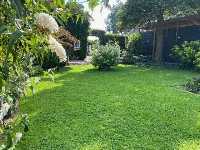 Voor optimaal gemak is de tuin voorzien van een automatische beregeningsinstallatie (RainBird, 2020) die via een app te bedienen is. De installatie werkt samen met een grondwaterpomp waar ook nog extra tappunten op aangesloten zijn. Het gazon wordt onderhouden door een robotmaaier.